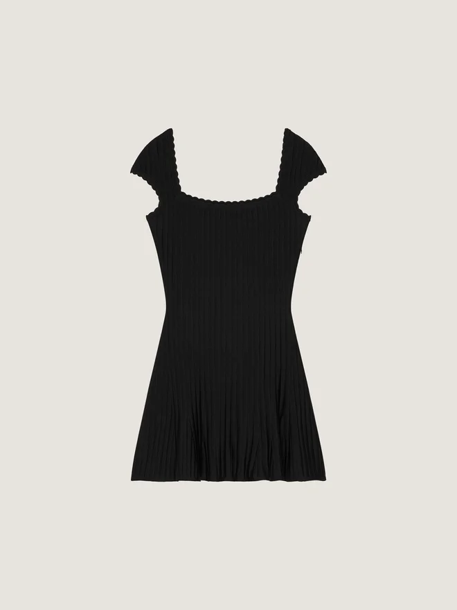 A-linjeformad stickad klänning med korta ärmar i ribbstickning. Fyrkantig halsringning. Vågig kant. Osynlig dragkedja på sidan. Utställd kjol.