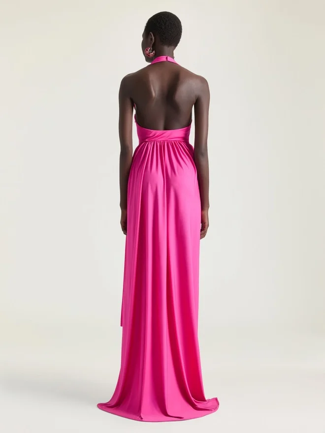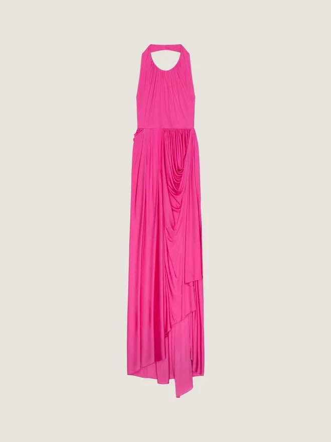 En silhuett inspirerad av gesten att drapera en läderjacka över en skyltdocka. Tygerna är vridna och lindade sensuellt runt kroppen, medan slitsar och fickor framtill skapar rörelse och attityd. Lång ärmlös klänning i jersey.Halterhals.Öppen rygg.Draperad.• Osynlig dragkedja på sidan och hake vid halsen. • Asymmetrisk längd: Längre bak. • Modellen är 177 cm lång och bär storlek 36. D FärgD FuchsiaD MaterialD 100 % viskosD Skötselråd• Får inte tvättas• Stryk vid högsta strykskivstemperatur (110 °C) Utan ånga Torkas inte i torktumlare Blek inte Kemtvätt med kolväten Ursprungsland: ItalienProduktkod: Bw22Sf3Yse-675 Skötselråd: Våra ateljéer designar unika plagg med mod och kreativitet, tillverkade av högkvalitativa material. För att bevara glansen hos din Givenchy-produkt rekommenderar vi att du förvarar den i en dammpåse av bomull på en torr och sval plats. Kemtvätt rekommenderas för de flesta av våra produkter. Se till att följa skötselanvisningarna på etiketten på din produkt. Besök gärna vår särskilda sida eller kontakta våra Givenchy-team direkt om du vill ha mer information.Tvätta inteStryk vid högsta strykskivstemperatur (110 °C) utan ångaTorktrumla inteBlek inteKemtvätt med kolväten