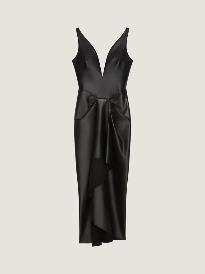 En silhuett inspirerad av gesten att drapera en läderjacka över en skyltdocka. Tygerna är vridna och svepta runt kroppen på ett sensuellt sätt, medan slitsar och fickor framtill skapar rörelse och attityd.- Lång ärmlös klänning i plonge-lammskinn.Djup V-ringning fram och bak.Vikning framtill.Dold dragkedja bak.Två fickor framtill.Modellen är 177 cm lång och bär storlek 36.Skötsel• Får inte tvättas• Får inte strykas• Får inte torktumlas• Får inte blekas• Får inte kemtvättasUrsprungslandItalienProduktkodBw22X2604J-001