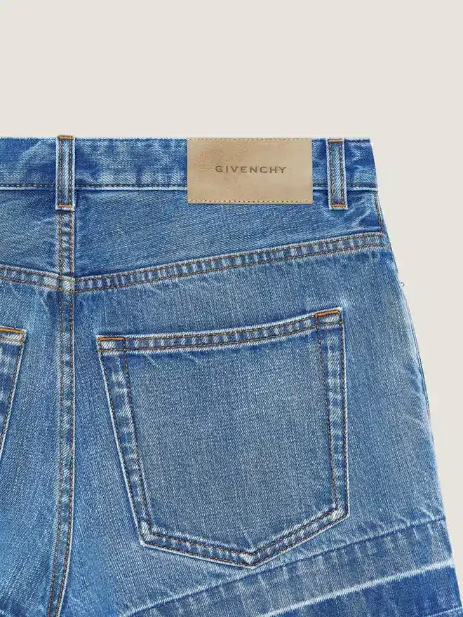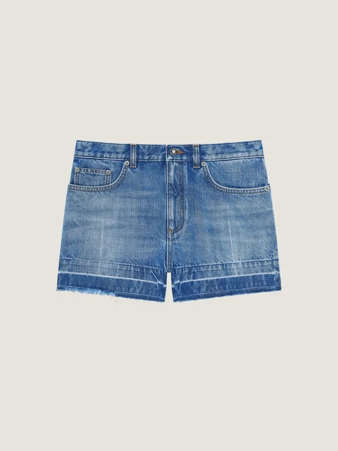 Shorts i mellablå denim med tvättad effekt. Midja med hällor, dragkedja och knäppning. Knappar med Givenchy-gravyr. Givenchy