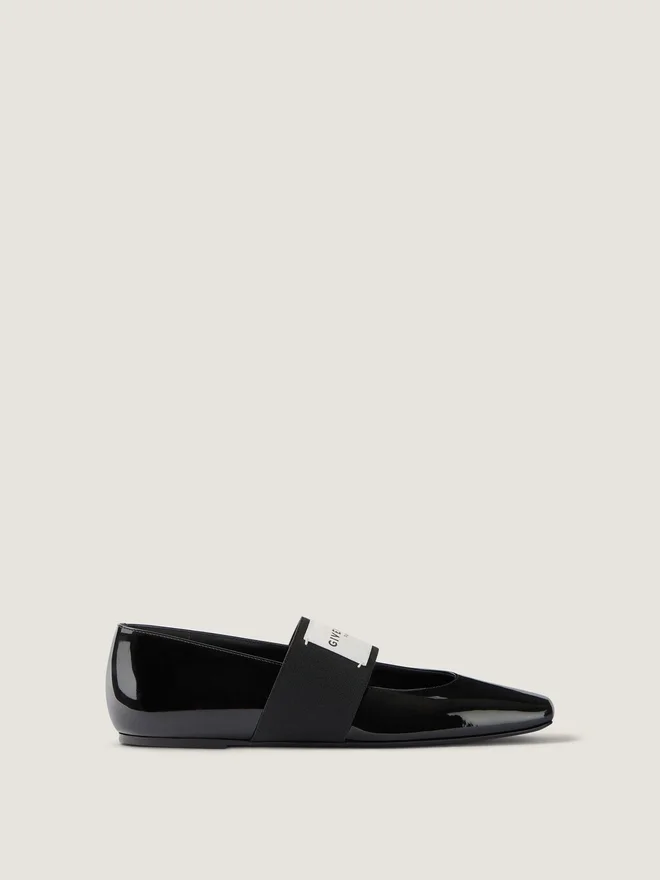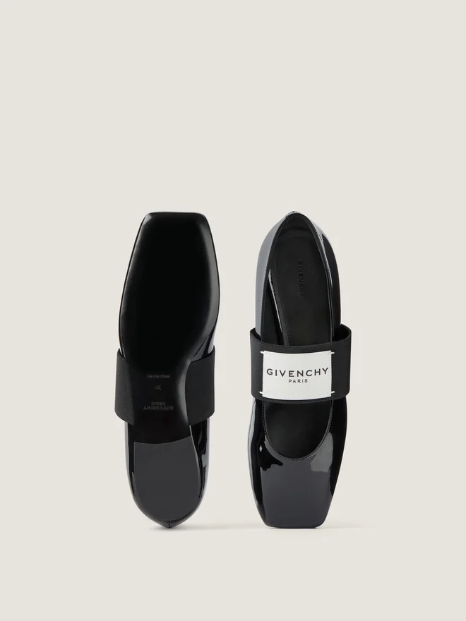 Platta ballerinaskor i lackat kalvskinn. Skuren fyrkantig linje. Elastiskt band med Givenchy Paris-läderetikett. Givenchy