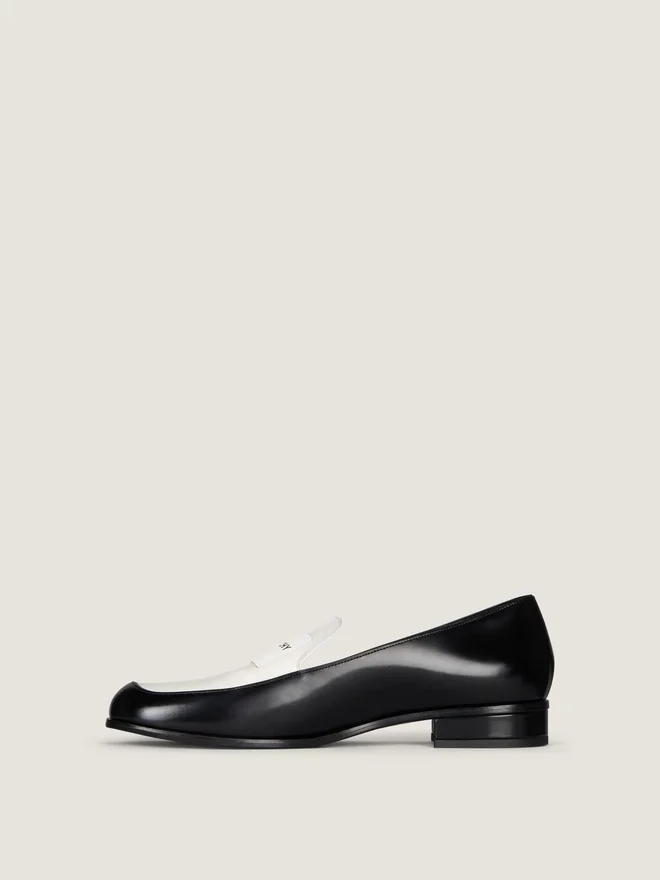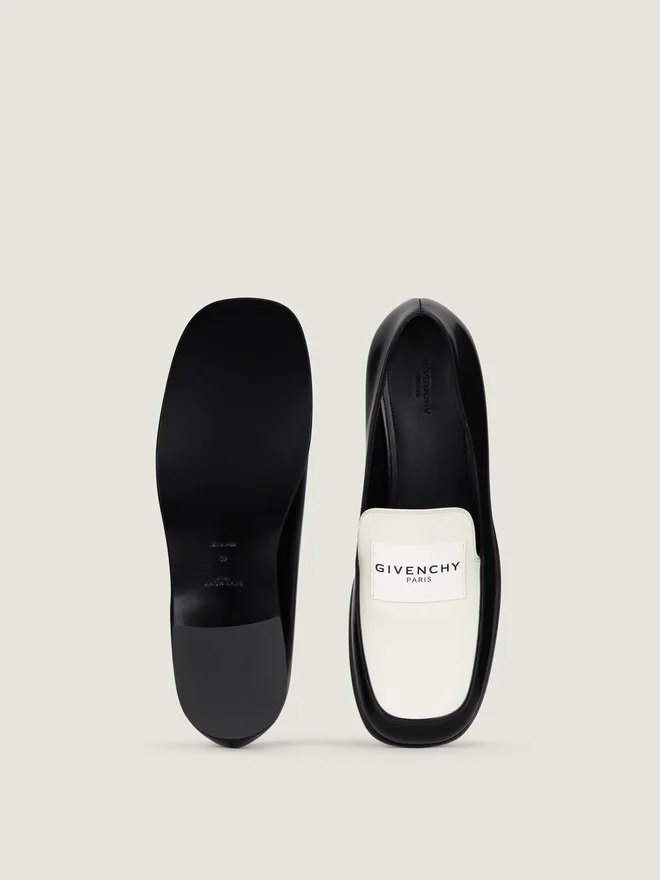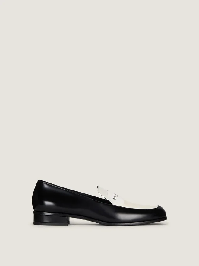 Loafers i tvåfärgat kalvskinn. Tux-serien. Givenchy Paris-läderetikett sydd på ovansidan. Givenchy Paris-signatur
