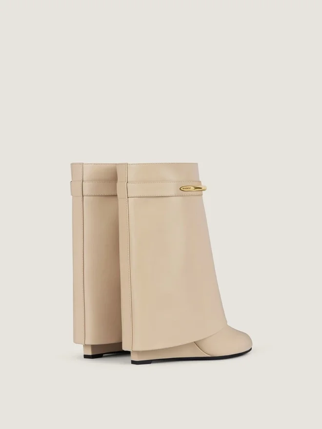 Ankelstövlar i kalvskinn. Shark Pinch-serien. Metallklämma med Givenchy-gravyr. Detaljer i metall med guldfinish. Spetsig tå.