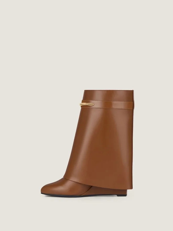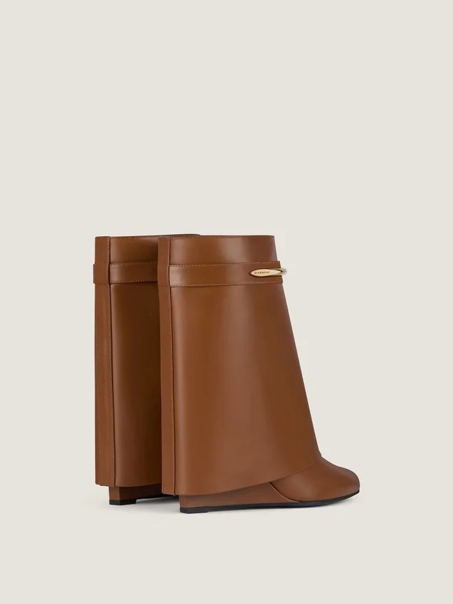 Ankelstövlar i kalvskinn. Shark Pinch-serien. Metallklämma med Givenchy-gravyr. Detaljer i metall med guldfinish. Spetsig tå.