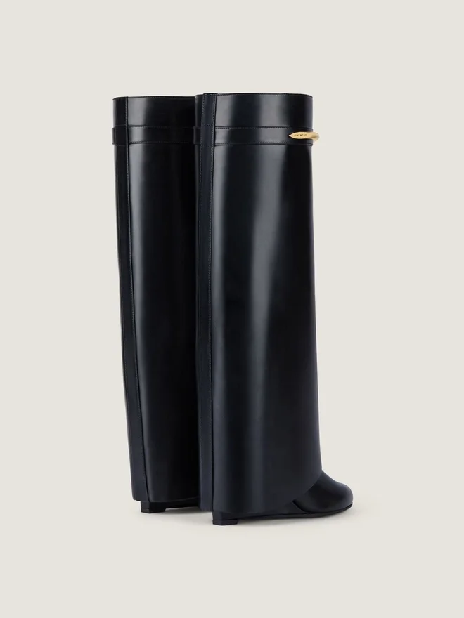 Stövlar i kalvskinn. Shark Pinch-linje. Metallklämma med GIVENCHY-gravyr. Detaljer i metall med guldfinish. Spetsig tå. Täckt