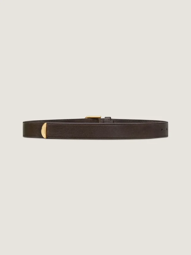 Långt bälte i glansigt kalvskinn. Voyou-serien. Ändknopp i metall med Givenchy-gravyr. Detaljer i metall med guldfinish.