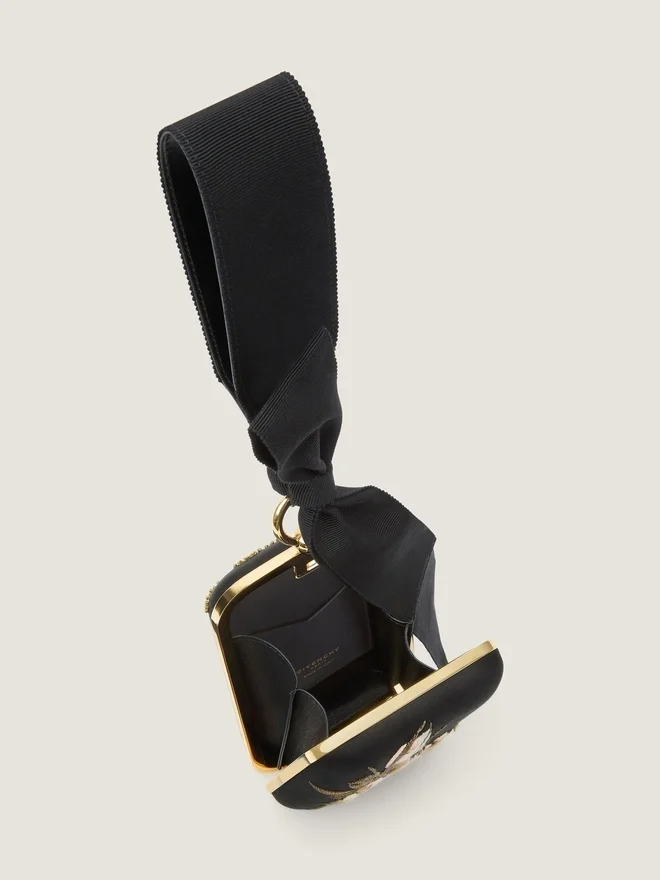 • Kvällsklutch i satin med blommiga broderier.• Praktiskt metallgångjärn.• Knuten rem med metallring.• Givenchy Paris-logotypen präglad på insidan.• Detaljer i metall med guldfinish.• Insatser i läder.• Ett kortfack på insidan.• Foder i nappa. • Rymmer små nödvändigheter som en iPhone, ett kortfodral och en läppstift.Mått3,9 tum x 7,1 tum x 2 tumRemlängdMin: 28 cm D UrsprungslandD ItalienD ProduktkodD Bb514Tb2Ch-001 Skötselråd Läder Läder är ett känsligt naturmaterial som bör användas och skötas med största omsorg. Varje läderprodukt är unik och utvecklar med tiden en patina som framhäver dess skönhet och karaktär. Varje märk är ett tidlöst minne att vårda. För att kunna njuta av och bevara glansen hos din Givenchy-produkt rekommenderar vi att du förvarar den i originalförpackningen på en torr plats när den inte används. Detta hjälper till att undvika exponering för fukt, värme och/eller ljuskällor som kan skada den. Det är också bäst att undvika kontakt med vatten, parfymer, kosmetika, fuktighetskrämer eller andra flytande produkter, eftersom dessa kan orsaka irreversibla skador på lädret. Canvas Vi rekommenderar att du rengör din Givenchy-produkt med en mjuk, ren trasa som är lätt fuktad och undviker kemiska produkter som kan skada tyget. Låt din Givenchy-produkt lufttorka och förvara den i sin originalförpackning på en torr plats, skyddad från fukt. Regelbunden skötsel är särskilt viktigt för ljusare nyanser, som är extra känsliga för smuts. Besök gärna vår särskilda sida eller kontakta våra Givenchy-team direkt om du vill ha mer information.