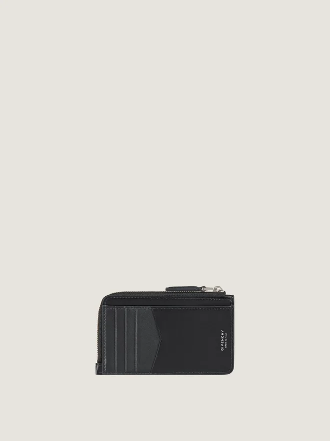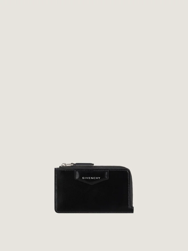 Kortfodral i slätt boxkalvskinn. Antigona-serien. Femkantig läderlapp med Givenchy-signatur i prägling på