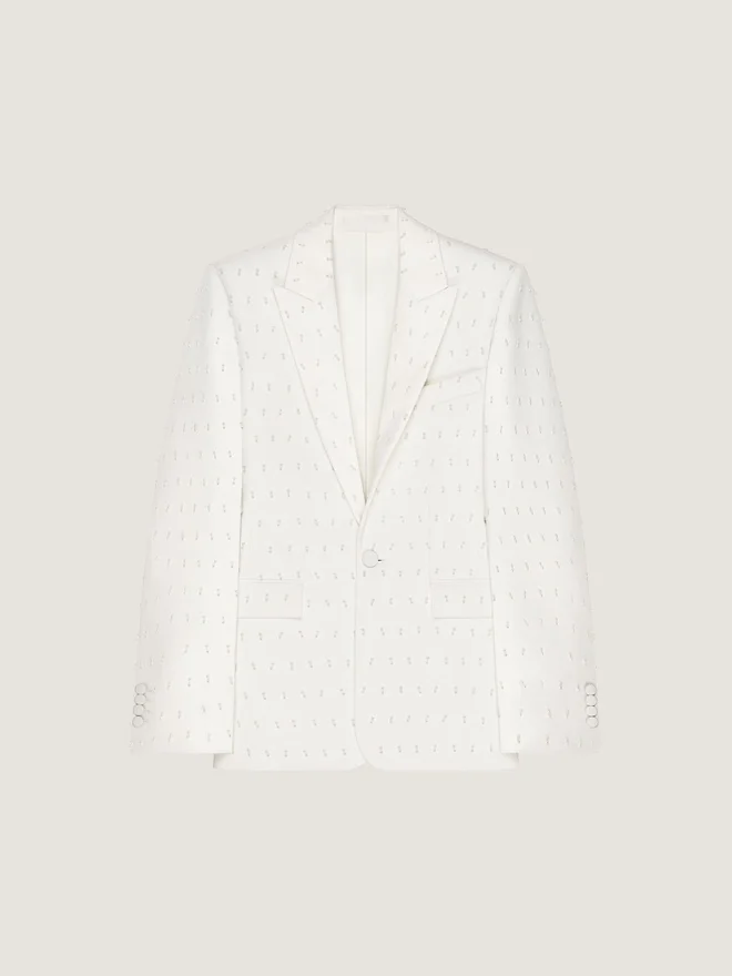 Kristaller, pärlor, paljetter och blomsterbroderier för in ateljéns hantverk i herrklädseln – från eleganta festkläder till vardagsplagg. Strukturerad jacka i ull och mohair med broderade pärlor.Spetsig krage.Enradig.Knappade manschetter. En bröstficka. Två fickor med lock fram. Satinfoder. FärgElfenbenMaterial65 % ull, 35 % mohair. Foder: 100 % cupro.Skötsel• Får inte tvättas• Får inte strykas• Får inte torktumlas• Får inte blekas• Får inte kemtvättasUrsprungslandItalienProduktkodBm30M21Yk1-105