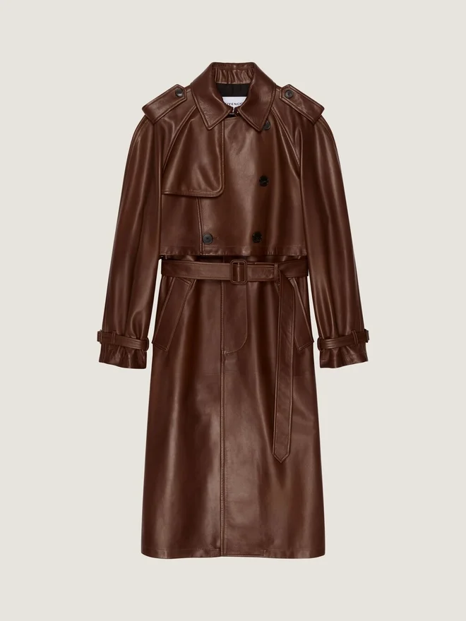 • Trenchcoat i Plonge-lammskinn.• Skärpkrage.• Givenchy Paris-lädermärke på övre delen av ryggen.• Knäppning och bälte.• Justerbar dragkedja vid ärmsluten.• Två sidfickor.• Avslappnad passform. • Foder med Givenchy Paris-jacquard över hela plagget. • Modellen är 185 cm lång och bär storlek 48. • Färg • Mörkbrun • Material • 100 % lammskinn. Foder: 100 % cupro.Skötsel• Får inte tvättas• Får inte strykas• Får inte torktumlas• Får inte blekas• Får inte kemtvättasUrsprungslandItalienProduktkodBm01Fm6Y46-201