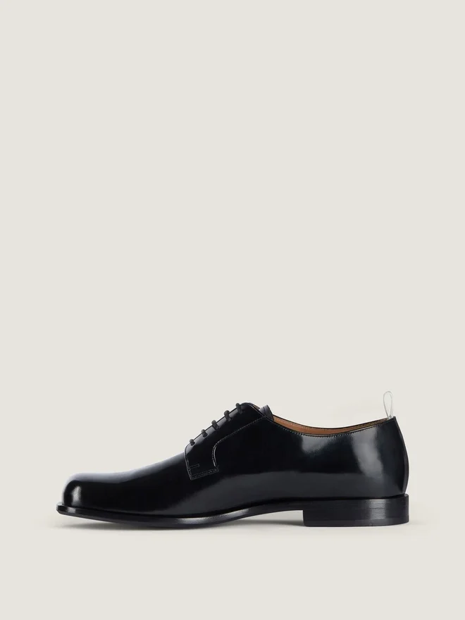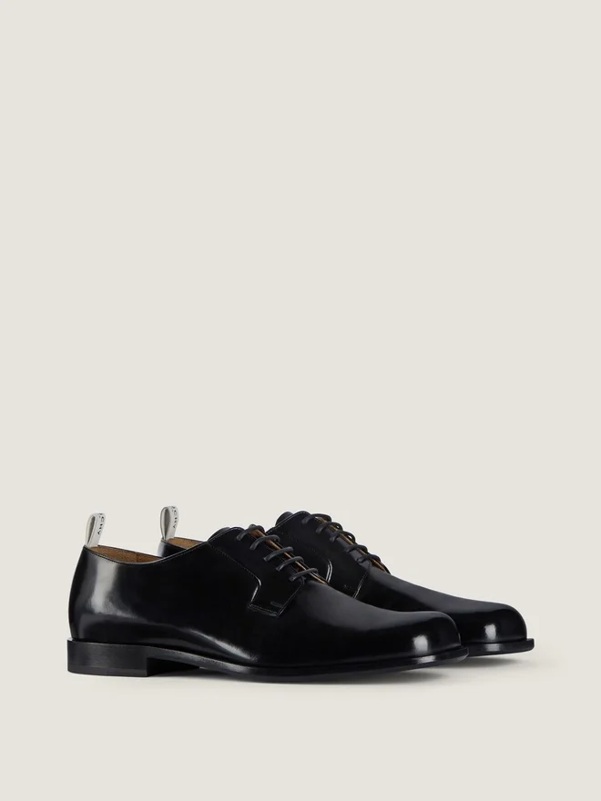 Derbyskor i borstat tjurläder. Tux-serien. Läderslinga med grosgrain-effekt och Givenchy Paris-signatur. Guldfärgat Givenchy